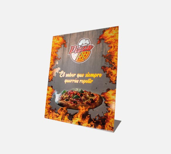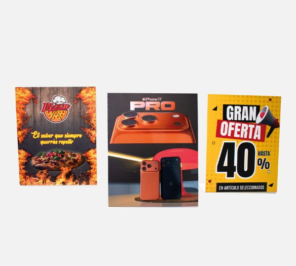 Contamos con dos tipos de impresión: la impresión en solvente de alta calidad sobre vinilo adhesivo, ofrece colores nítidos de una alta duración, la impresión en UV también es sobre vinilo diferenciada de la primera a su posibilidad de barniz parcial sobre la impresión, ofreciendo un plus llamativo a tus habladores.